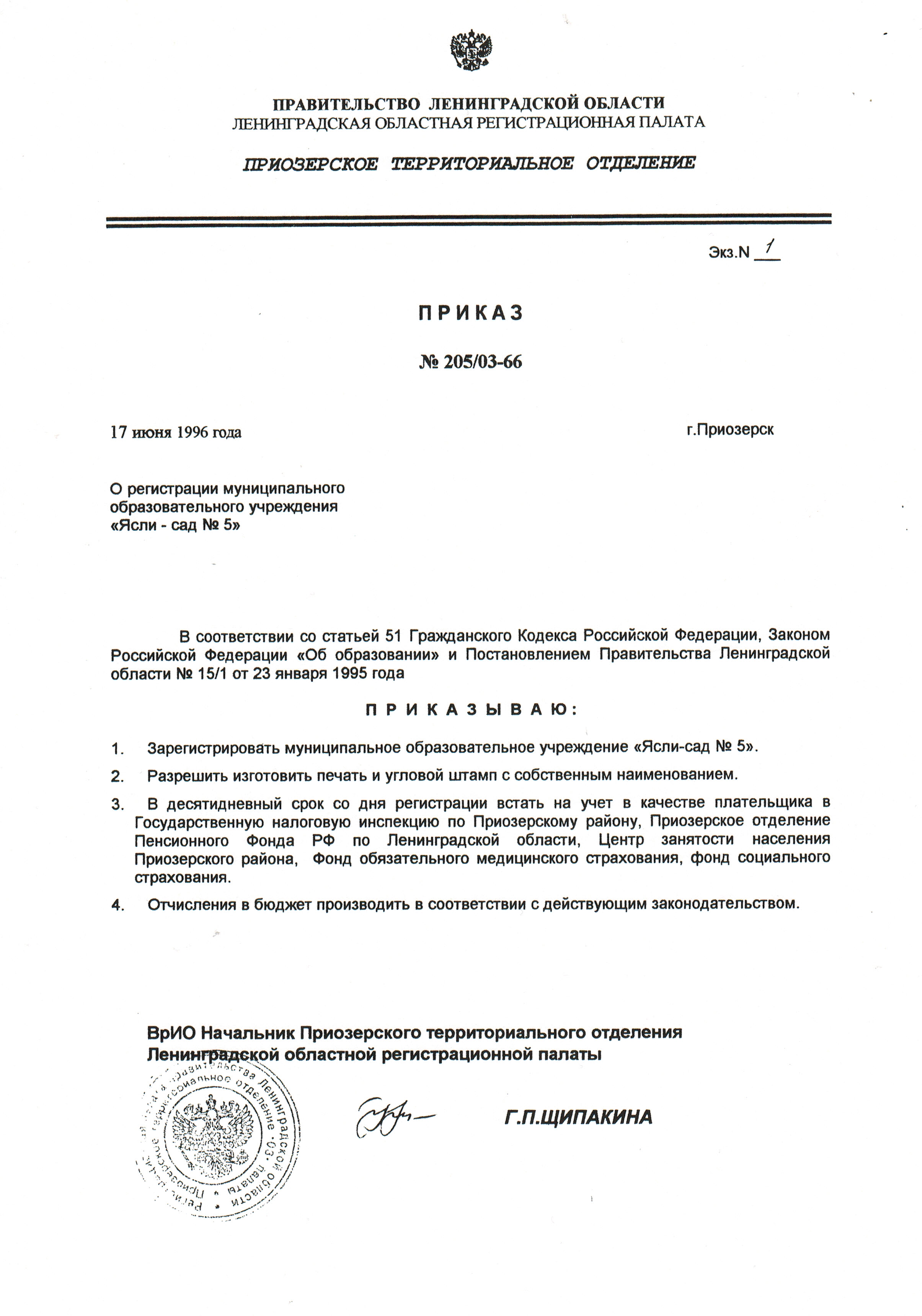Приказ о регистрации муниципального образовательного учреждения "Ясли сад №5"